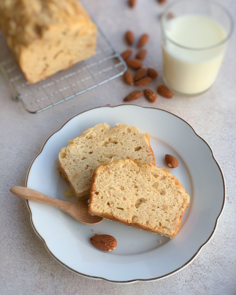 Ingrédients : 130ml de blancs d’œufs liquide @team.nutrition.france ou 4 blancs d’œufs, 150gr de farine, 200gr de fromage blanc, 100gr de purée d’amande, 15gr d’amandes effilées, 35gr de stevia (purevia), 1/2 gousse de vanille et quelques gouttes d’arôme vanille, 1 pincée de bicarbonate.