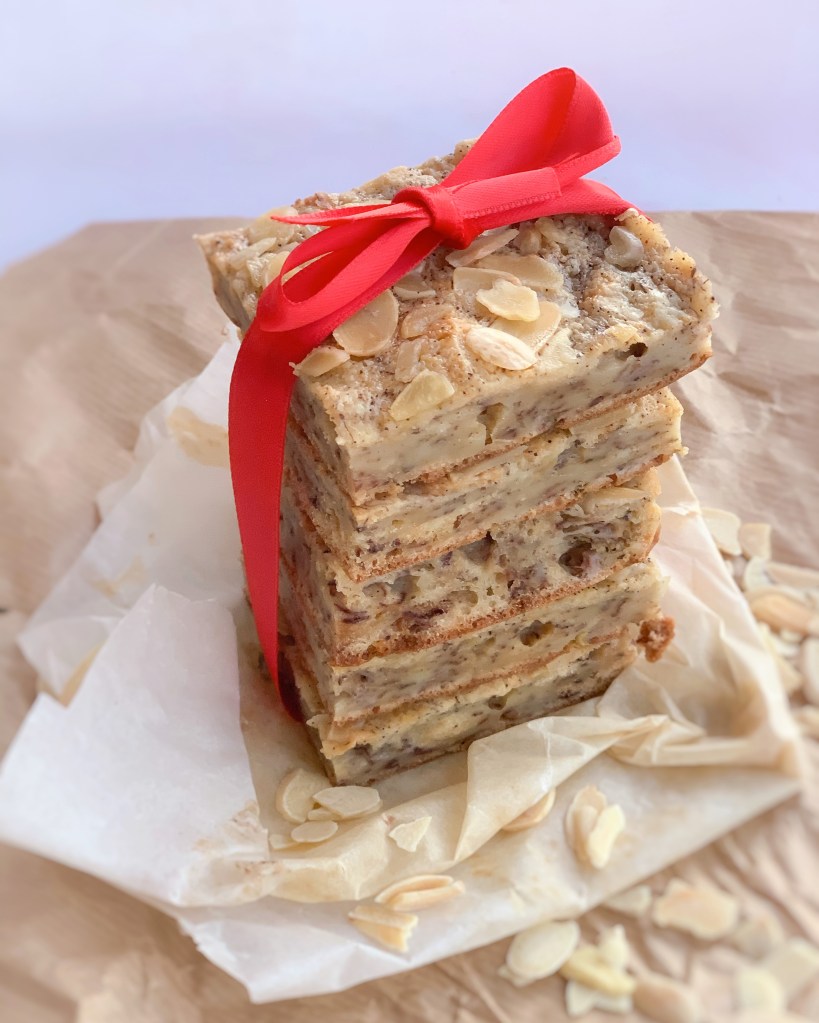 - Déposez la pâte dans un petit moule tapissé de papier cuisson, saupoudrez de sucre vanillé et enfin, d’amandes effilées.