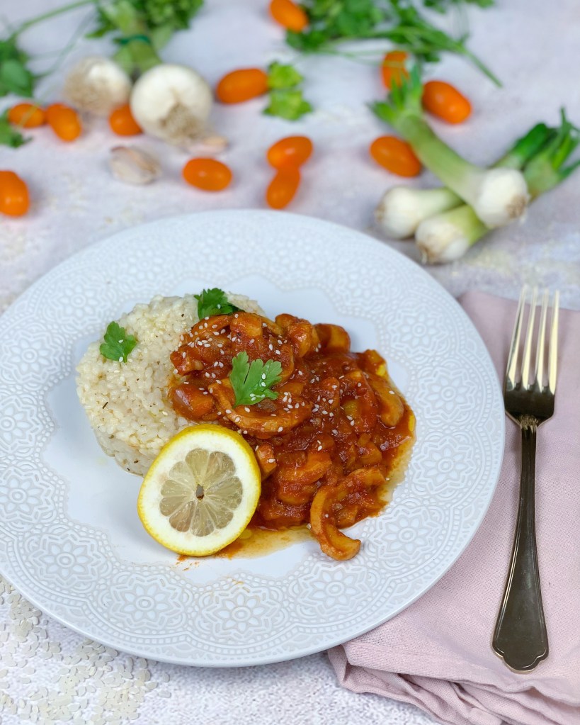 Ingrédients : 340gr d’anneaux de calamar (frais chez le poissonnier, 20gr huile d’olive, 400gr de pulpe de tomate, 200ml d’eau, 2 gousses d’ail, 100gr d’oignon, 100gr de poivron (ici jaune), sel, poivre, piment d’espelette