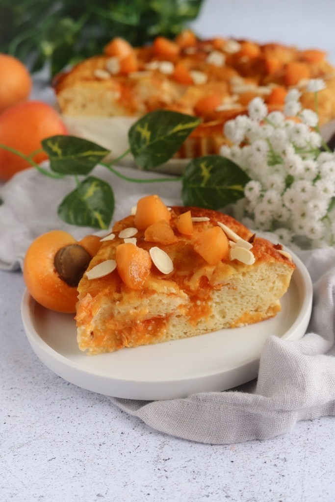 - Dénoyautez vos abricots puis coupez des morceaux, ajoutez sur le gâteau et « mélangez » grossièrement pour qu’il y en ai partout