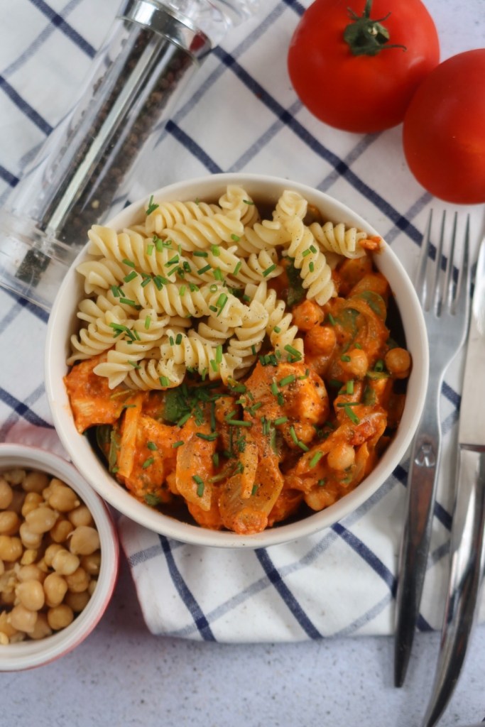 - Pendant ce temps, coupez votre poulet en cube et faites cuire des pâtes, ou du riz.